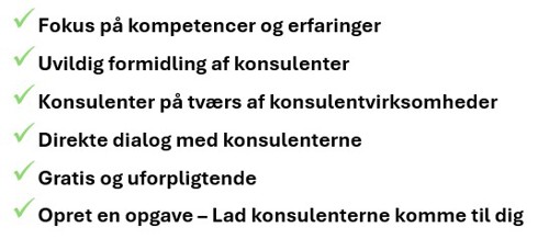 Vores platform gør det let at finde netop den konsulent, der matcher din opgave og virksomhedens behov.
