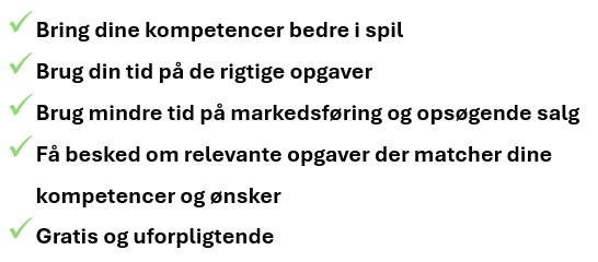 Du sparer tid på opsøgende salgsarbejde og øger chancen for at få opgaver, der matcher det, du er bedst til – både fagligt og geografisk.